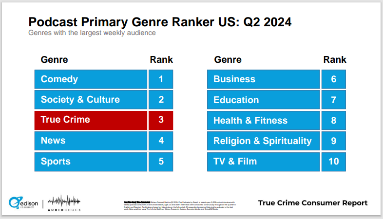 As reported in Inside Radio, Edison conducted an online study comprised of more than 3,000 U.S. persons 13+ this past May. The study is loaded with smart data about the popularity of “true crime,” which came in third place overall in the company’s “Podcast Primary Genre Ranker” in the U.S. in Q2 2024, and second among podcast bingers: